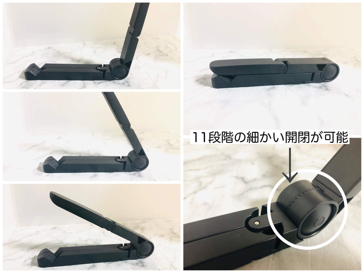 このスタンドは中央部分が細かく、11段階に開閉できるようになっていて自分好みの角度に調整可能!使い心地も抜群です◎