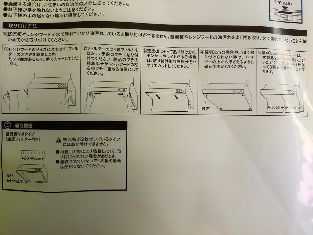 使用方法を見てみると、整流版付専用と書かれています。整流版とはレンジフードを見たときに見える薄くて四角いプレートのこと、筆者はガードと言っていましたが正式名は整流版というのですね。