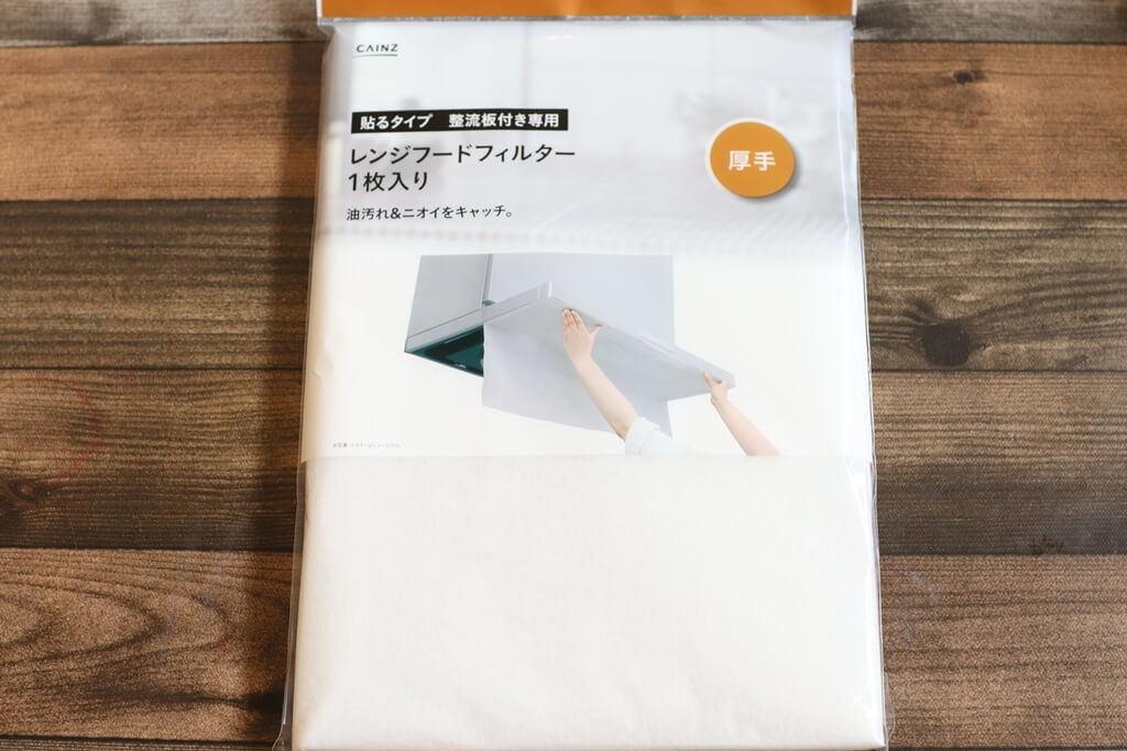 カインズの「貼るタイプ 整流版付き専用 レンジフードフィルター」は、まずパッケージの写真を見て、「これいいかも!」と思ったんです。