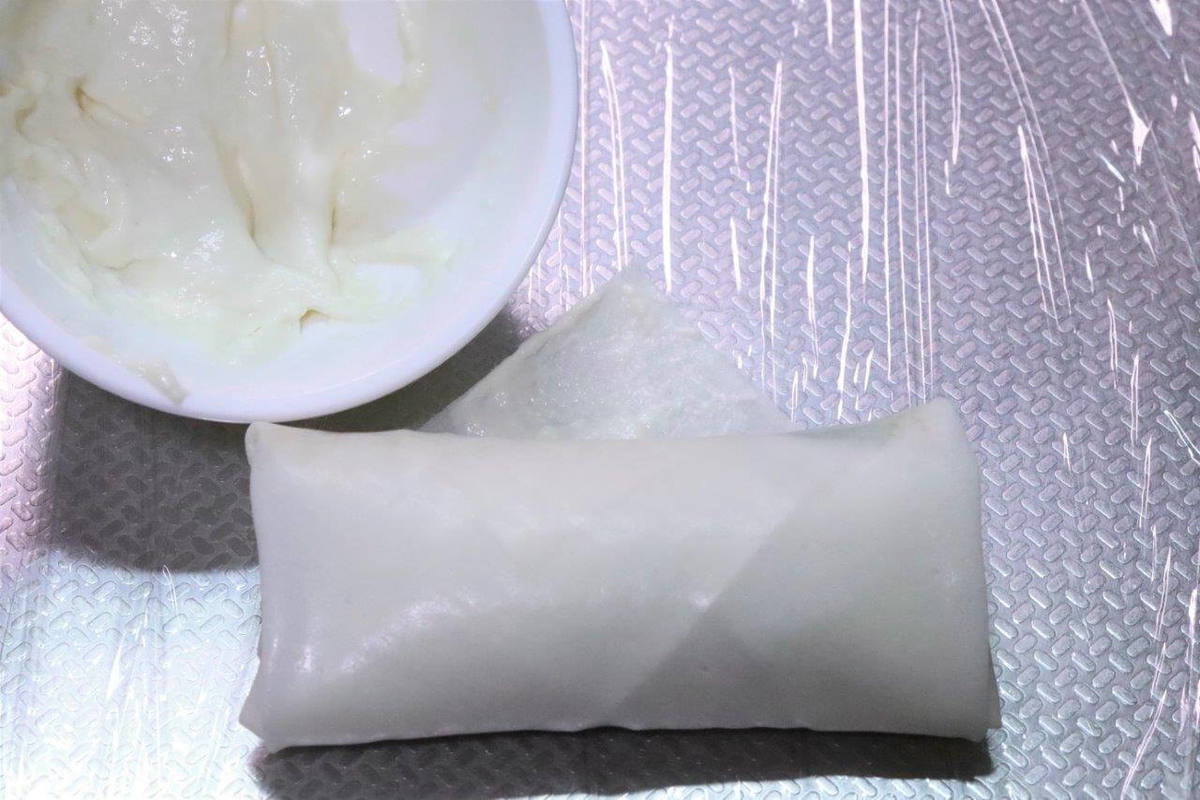 巻き終わりは小麦粉を水でといた「小麦粉のり」でとめておきます。どろっとした濃度でしっかりとのりづけし、揚げているときにはがれないようにしましょう。