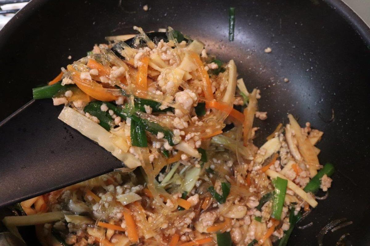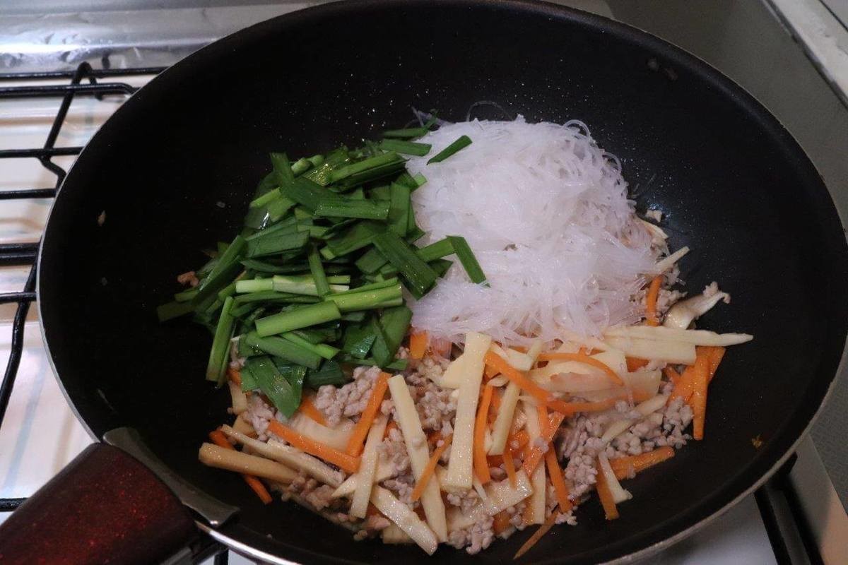 3.たけのこ、にんじん、しいたけを炒め、ニラと春雨を加えたらざっと炒め合わせる。