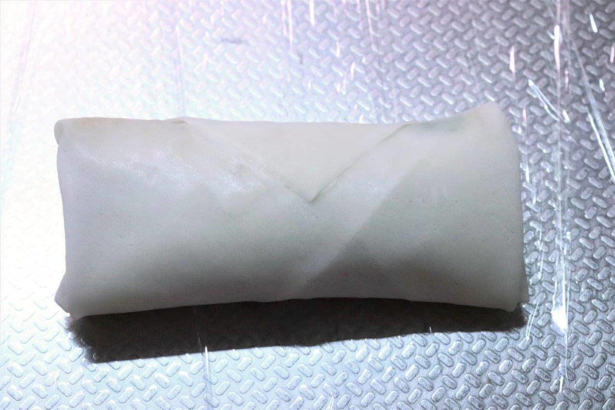 具材を包むときに空気が入ると爆発の原因になるため、空気が入らないようにぴっちり包みましょう。空気を抜くように皮を押さえながら包むのがポイントです。