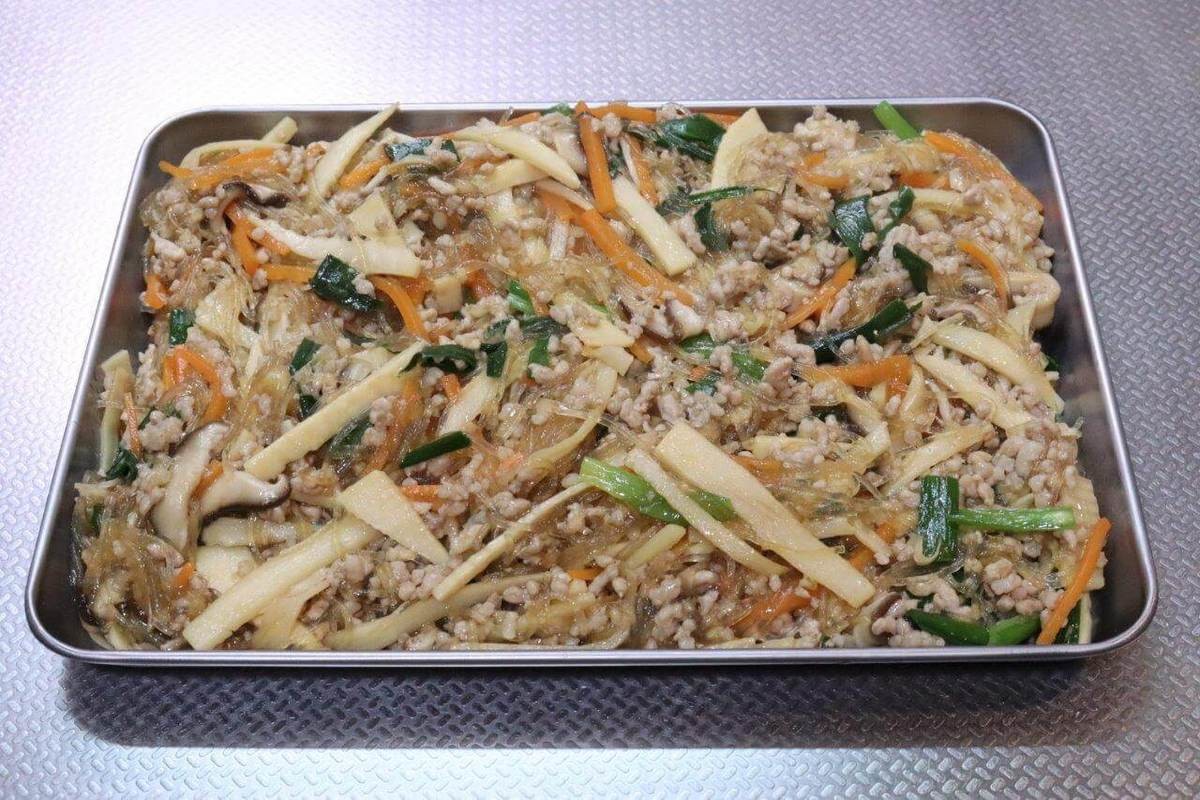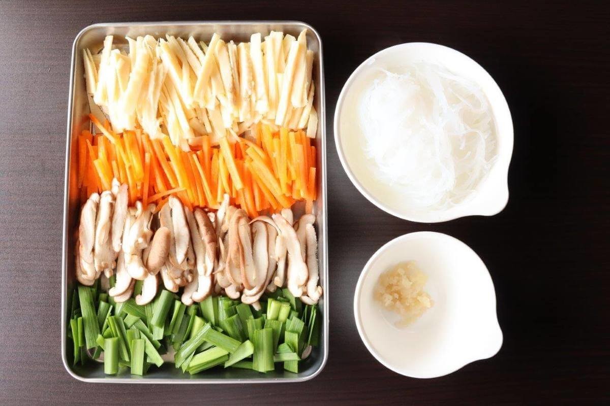 1.春雨は規定通りに戻し、3cm幅に切る。たけのこ、にんじん、しいたけは細切りにする。ニラは2~3cm幅に切る。しょうがはみじん切りにする。