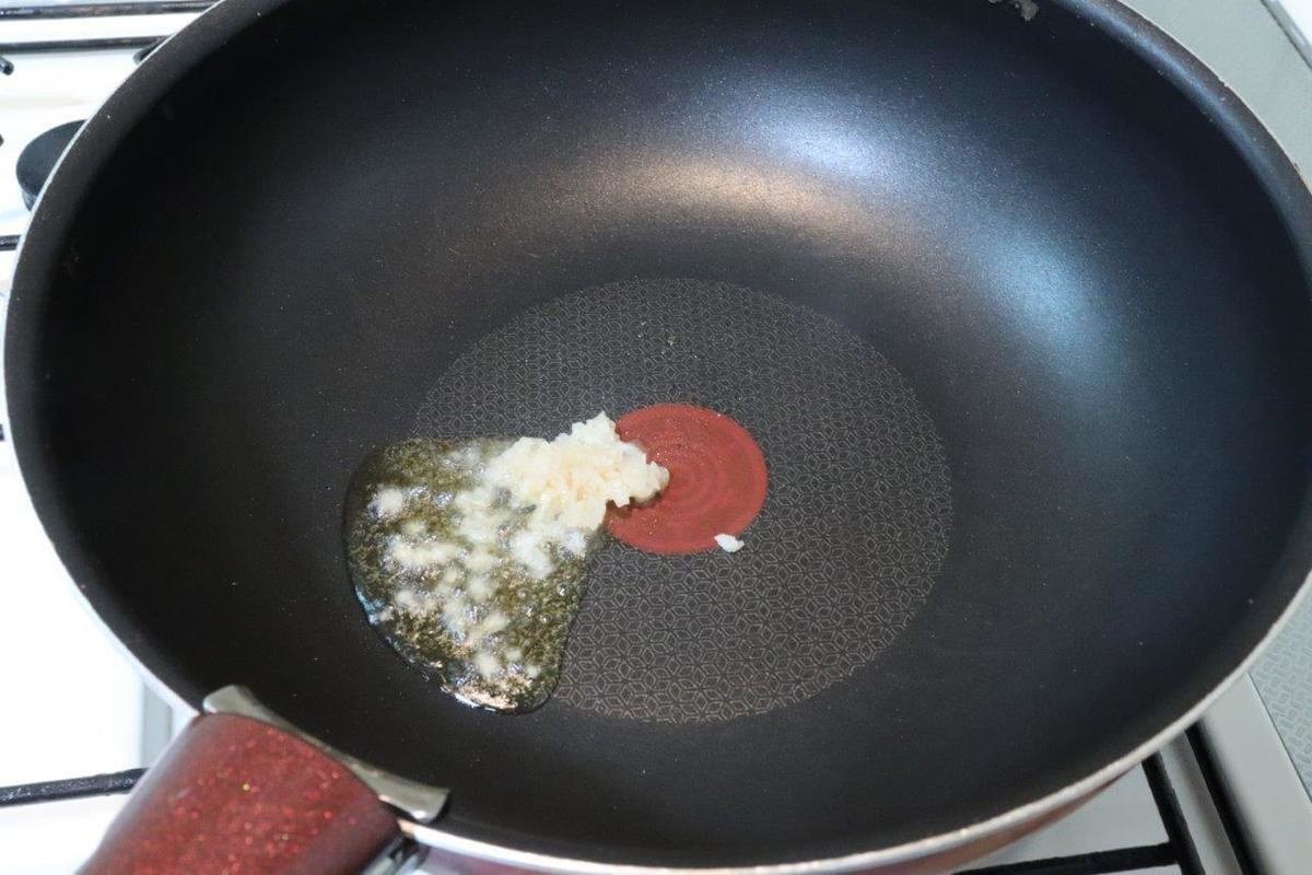 2.フライパンにごま油としょうがを入れて中火にかけ、香りが立ってきたら豚ひき肉を加えて色が変わるまで炒める。