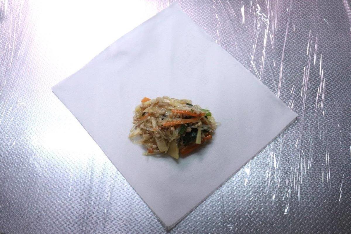 5.具材を10等分にして春巻きの皮で包む。具材は皮の手前にのせ、左右を折って手前から折り返して包む。巻き終わりは水溶き小麦粉をつけてとめる。