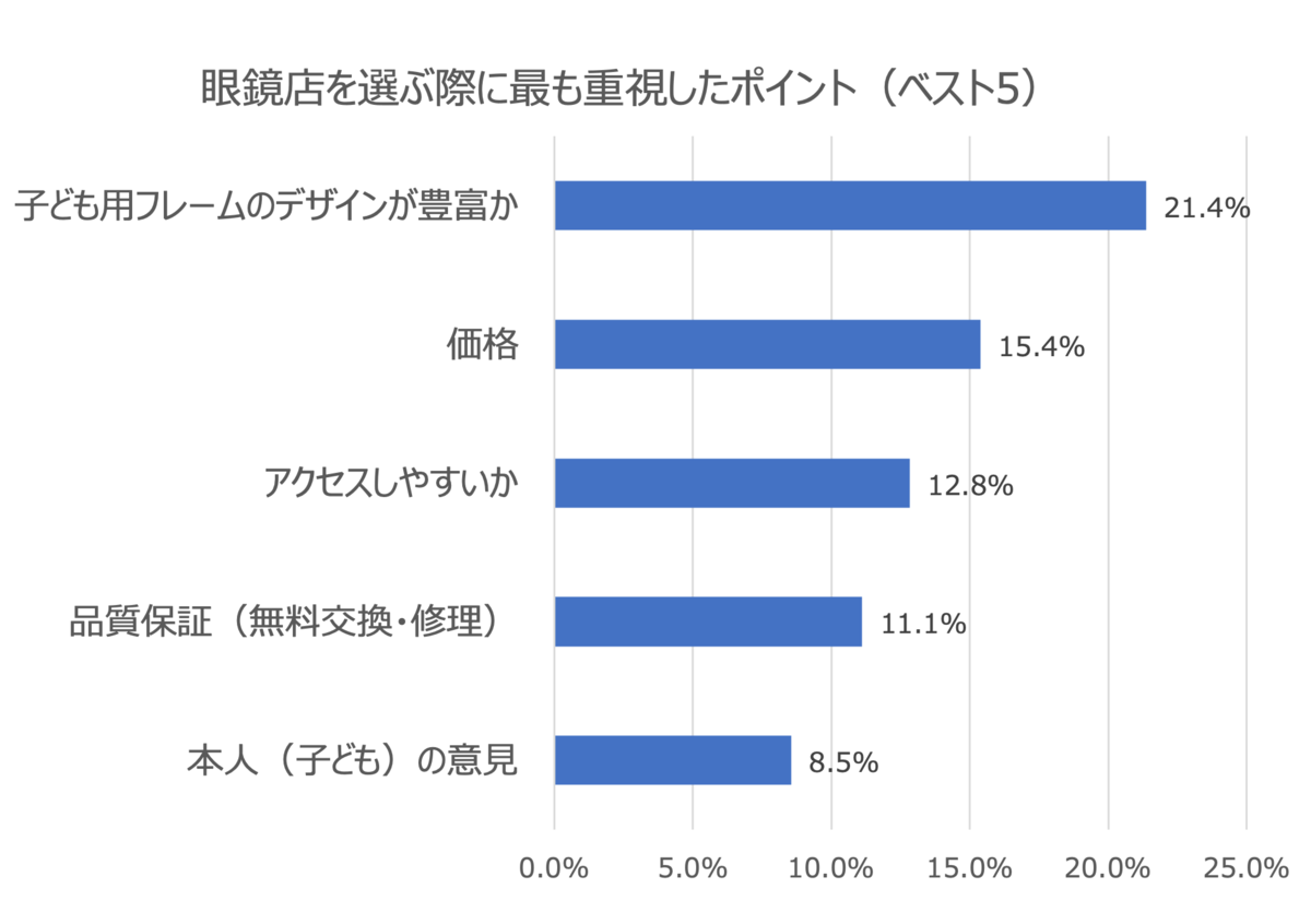 店舗選びで最も重視したポイントは「フレームデザインの豊富さ」がトップに。続いて「価格」「アクセスしやすいか」「品質保証」「子どもの意見」となりました(上記グラフ)。