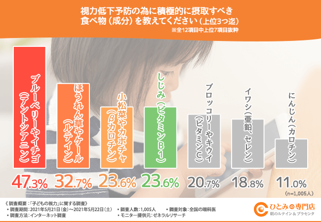 そこで、「視力低下予防の為に積極的に摂取すべき食べ物(成分)を教えてください(上位3つ迄)」と質問したところ、『ブルーベリーやイチゴ(アントシアニン)(47.3%)』と回答した方が最も多く、次いで『ほうれん草やケール(ルテイン)(32.7%)』『小松菜やカボチャ(βカロチン)(23.6%)』『しじみ(ビタミンB1)(23.6%)』『ブロッコリーやキウイ(ビタミンC)(20.7%)』と続きました。
