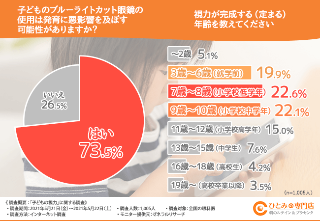 「子どものブルーライトカット眼鏡の使用は発育に悪影響を及ぼす可能性がありますか?」と質問したところ、『はい(73.5%)』と、7割以上の眼科医が悪影響の可能性に賛同しました。