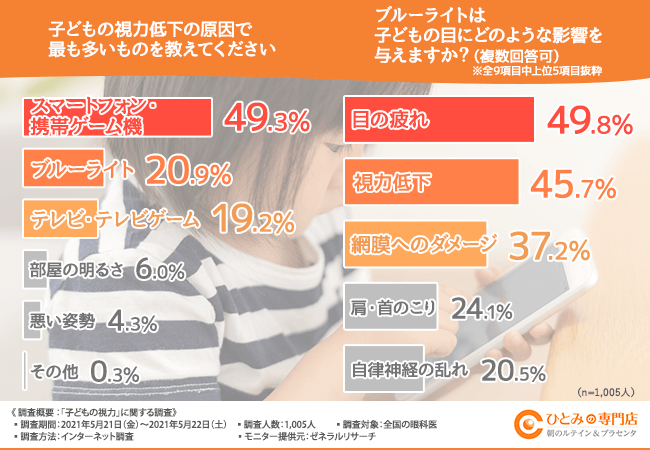 「子どもの視力低下の原因で最も多いものを教えてください」と質問したところ、『スマートフォン・携帯ゲーム機(49.3%)』と回答した方が最も多く、次いで『ブルーライト(20.9%)』『テレビ・テレビゲーム(19.2%)』『部屋の明るさ(6.0%)』『悪い姿勢(4.3%)』と続きました。