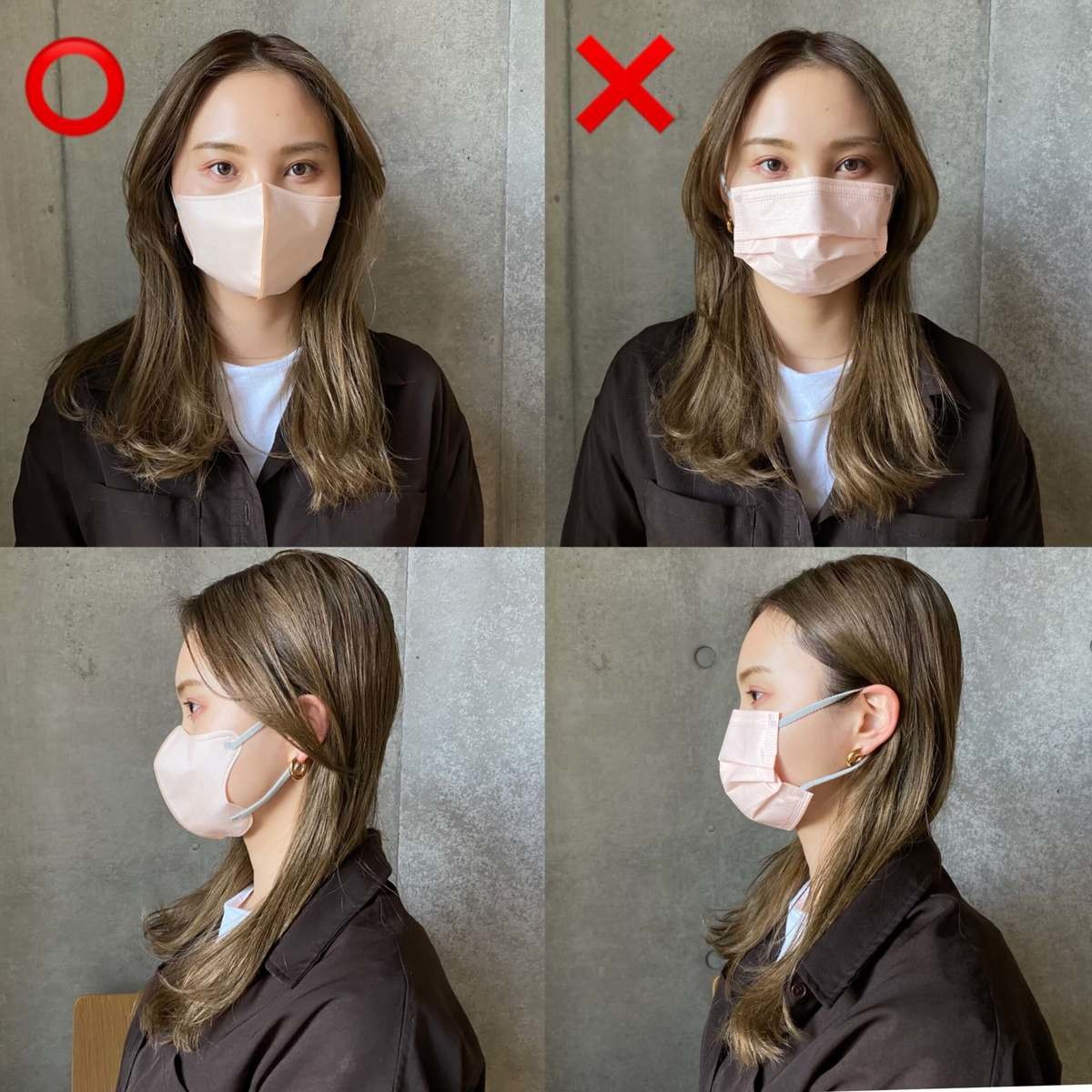 横顔も、立体型だと丸みのあるフェイスラインにぴったりフィットして、横顔もきれいに見せてくれますね。プリーツ型は、横顔がのっぺりとした印象です。