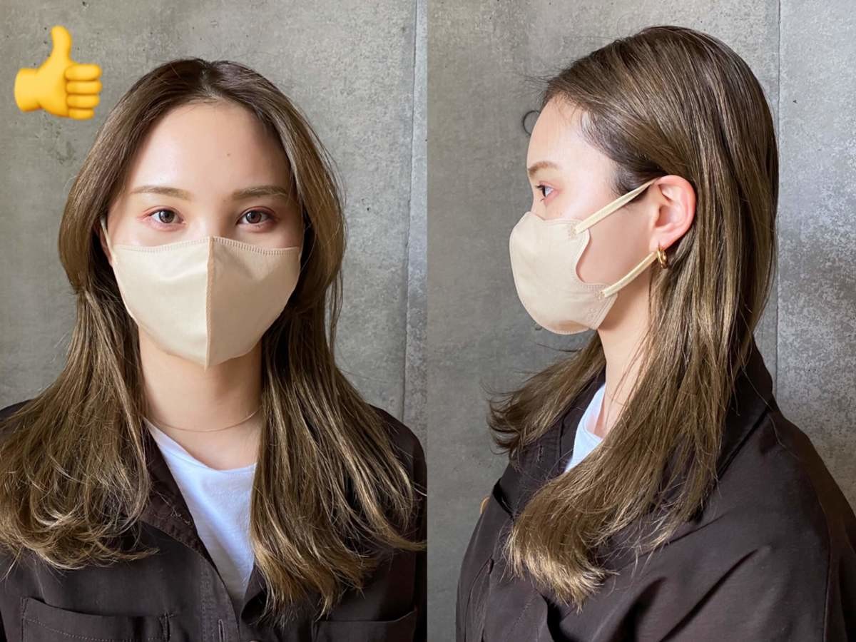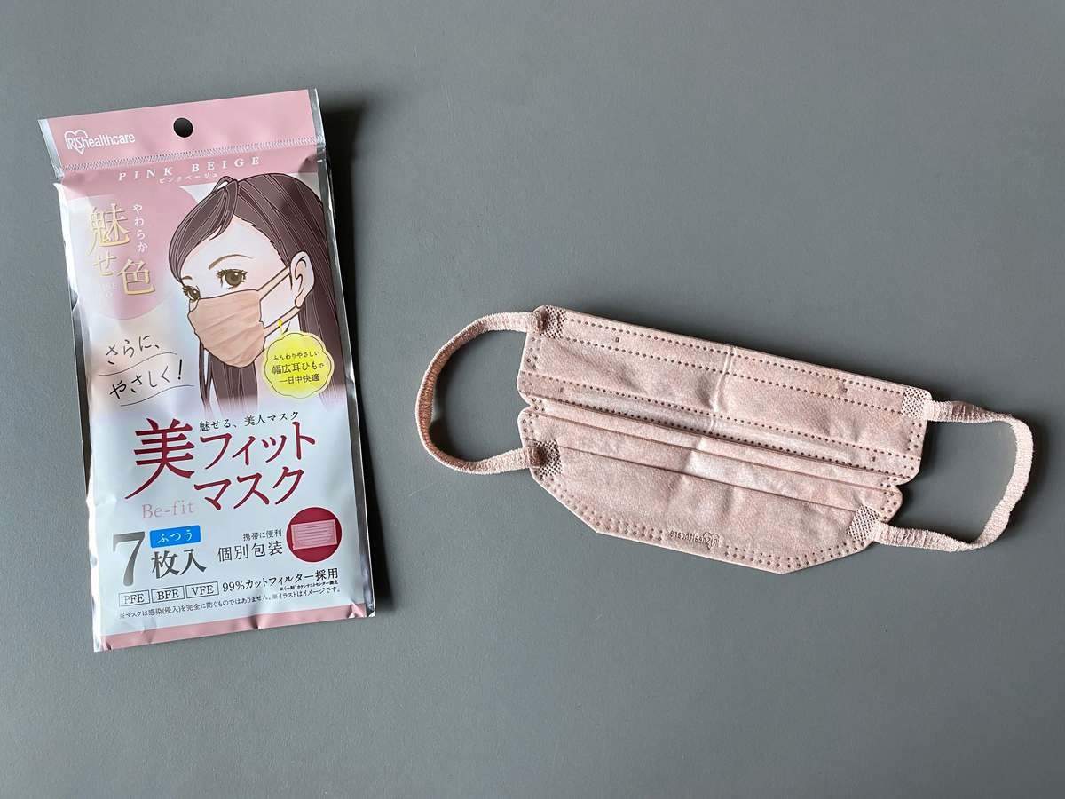 小顔に見せるには、形も大切だけど、カラー選びも大切。ピンクベージュは、白色のマスクを付けた時よりも、肌なじみがよくて、顔が引き締まって見え、小顔効果があるなと思いました。