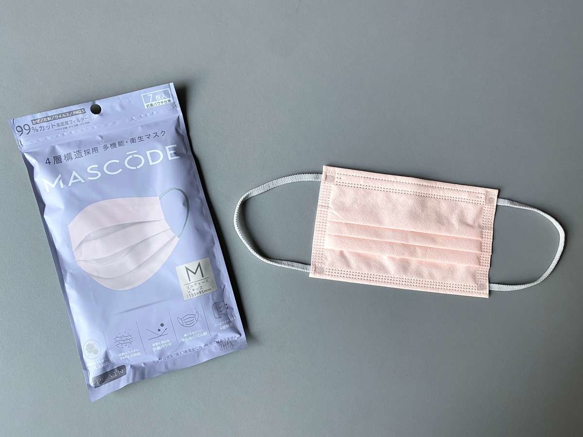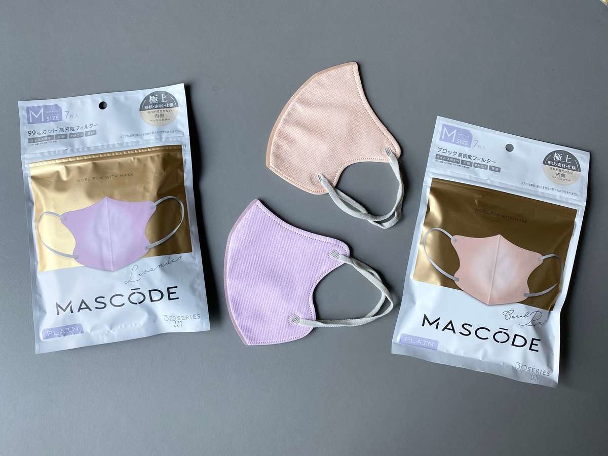 サン・スマイル「MASCODE」(コーラルピンク)の立体型とプリーツ型を付け比べてみました。同じブランド・同じカラーなのに、形が違うだけで、全然印象が違うと思いませんか?