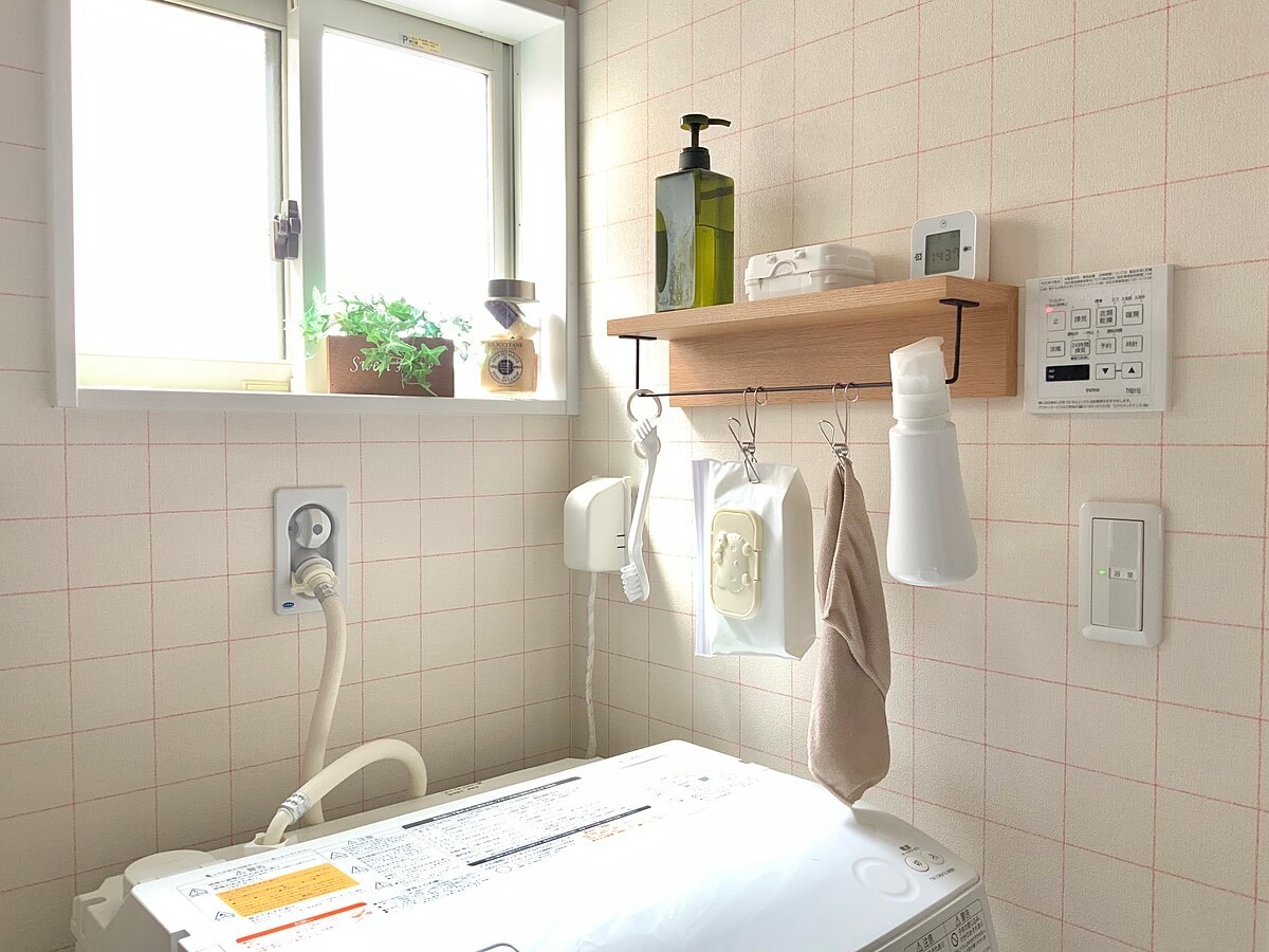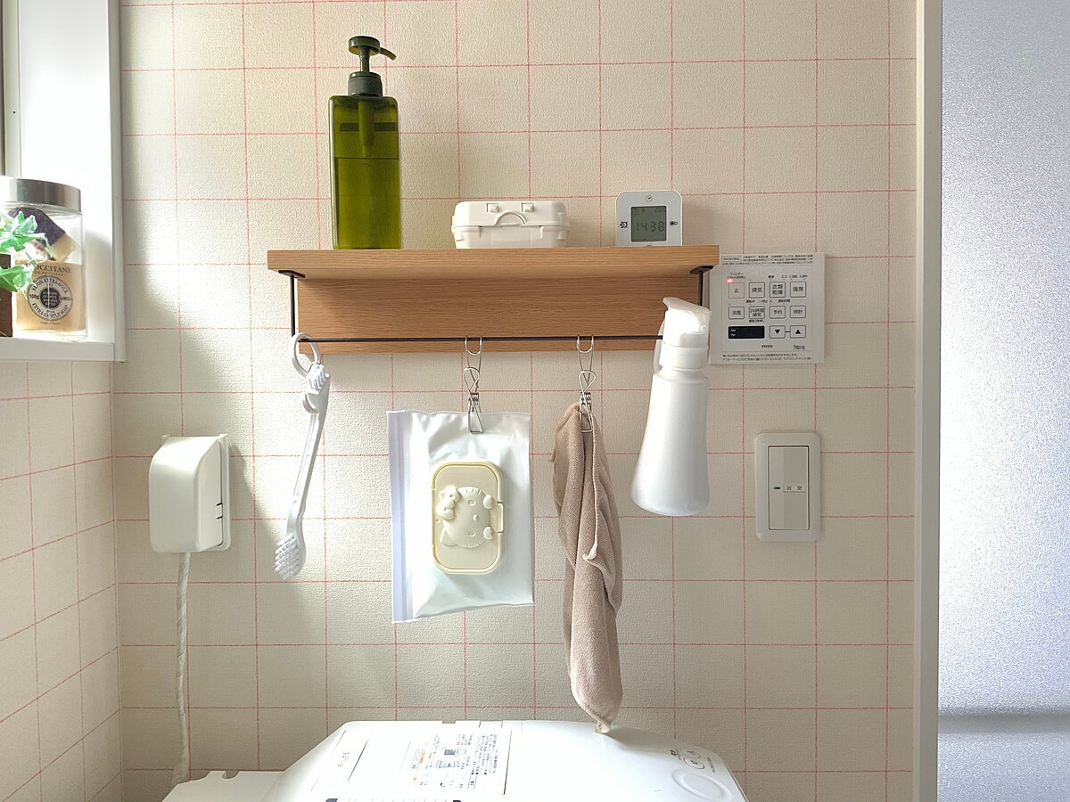 片づけ遊び指導士のヨムーノライターのアリカさんは、洗濯機置き場の壁に「家具棚44cm」とセリアの「アイアンバー」を組み合わせて設置しました。