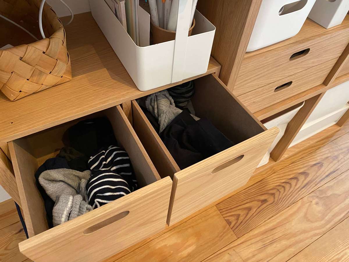 スタッキングシェルフに組み合わせて使えるスタッキングチェストも別売りされています。同じオーク材でなじみがいい引き出しはジャストフィット。お子さんの収納スペースにしている家庭では、ハンカチやティッシュ、巾着袋などをしまっています。