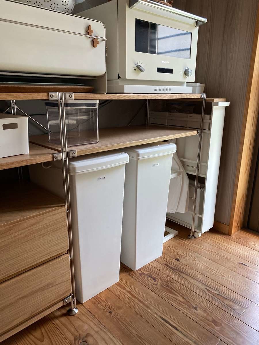 ゴミ箱真上の棚は本当はなくても良かったくらいですが、上にちょっとしたモノを置けるスペースも付けられたので、結果的には満足です♪