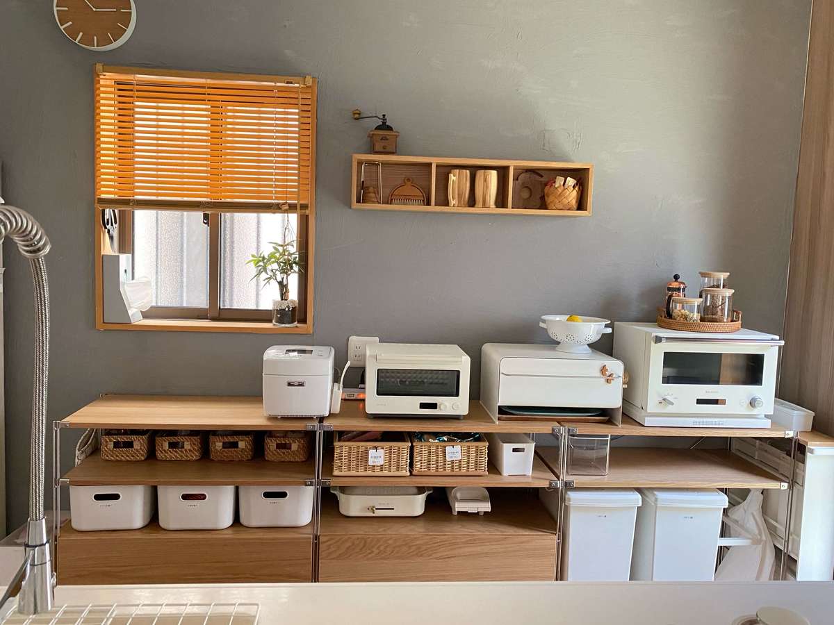 全体のサイズは、ユニットシェルフ3つ分を連結させているため約260cm弱です。これだけ幅があれば電子レンジやトースターなど、色々並べても余裕があるくらいです。希望通りの形になったので、大満足しています。