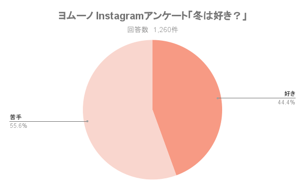 ヨムーノのInstagram@yomuno_officialで、「冬は好き?」というアンケートをとったところ、「好き」が44%(160票)、「苦手」が56%(200票)という結果に。苦手だと感じている人の方が少し多いようです。